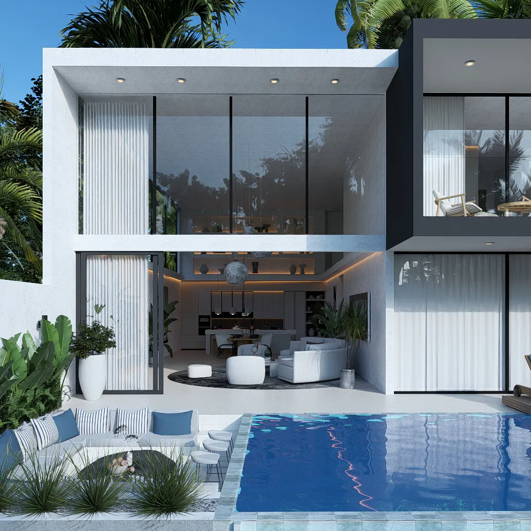 A Bankun villák megjelenése egyszerre letisztult és nagyvonalú. A modern minimalizmus trópusi elemekkel találkozva olyan életteret formál, amely a tulajdonos számára mindennap természetes kényelmet és nyugalmat biztosít, miközben kiemelkedő bérbeadási potenciált teremt. A tágas, fényben úszó belső terek, a hatalmas üvegfelületek, a privát medencék és a gondosan kialakított trópusi kertek mind azt szolgálják, hogy a villa hosszú távon is prémium kategóriában maradjon, akár saját használatról, akár befektetésről van szó.